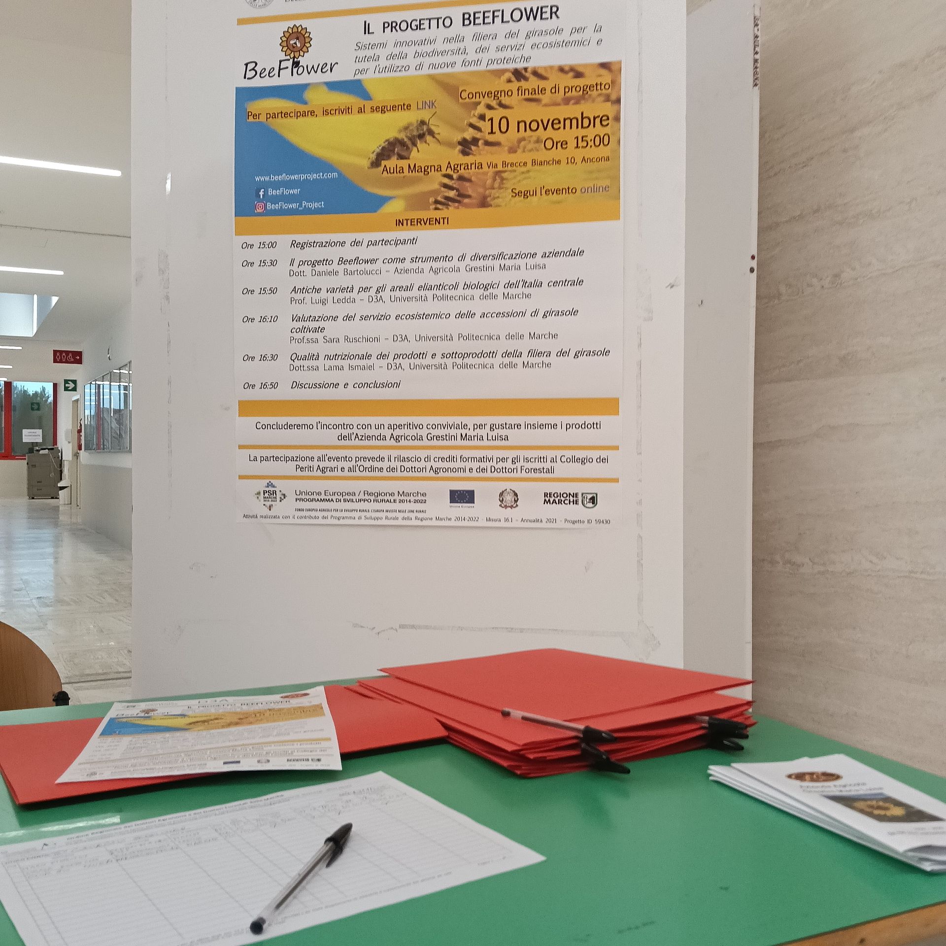Il convegno conclusivo del progetto è stato un vero successo! Gli interventi, ricchi di spunti e riflessioni, si sono svolti nella splendida cornice dell’Aula Magna del Dipartimento di Scienze Agrarie, Alimentari e Ambientali dell’Università Politecnica delle Marche, che ha accolto numerosi partecipanti sia in presenza che online. Al termine dei lavori, un ricco buffet ha offerto a tutti i presenti l’occasione di condividere un momento conviviale, con prodotti dell’Azienda Agricola Grestini Maria Luisa (azienda capofila del progetto BEEFLOWER) e dell'Azienda Agraria Didattico-Sperimentale "Pasquale Rosati" dell'Università Politecnica delle Marche. Cogliamo infine l'occasione per rivolgervi un profondo ringraziamento per aver seguito con entusiasmo le attività e lo sviluppo del progetto, che giunge ora al suo termine. È stato un percorso intenso e stimolante, reso possibile anche grazie al vostro interesse e alla vostra partecipazione attiva. Il GO di BEEFLOWER EN - Project Final Conference and Greetings from the Operational Group The final conference of the project was a true success! The presentations, full of insights and reflections, took place in the beautiful setting of the Aula Magna of the Department of Agricultural, Food and Environmental Sciences at Marche Polytechnic University, which welcomed numerous participants both in person and online. At the end of the event, a generous buffet offered all attendees the opportunity to share a convivial moment, featuring products from Grestini Maria Luisa Farm (the project lead partner) and the Pasquale Rosati Teaching and Experimental Farm of Marche Polytechnic University. Finally, we would like to express our heartfelt thanks for following the project’s activities and development with enthusiasm. The project has now come to its conclusion, marking the end of an intense and stimulating journey, made possible also thanks to your interest and active participation. The BEEFLOWER Operational Group