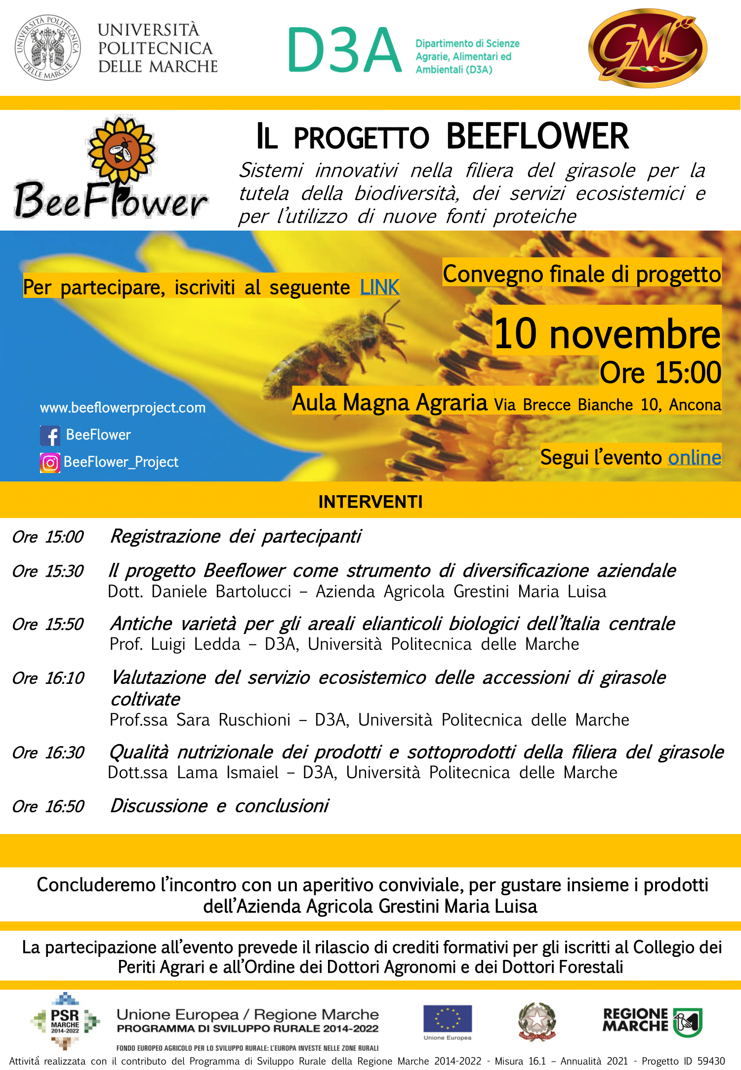 Siete invitati a partecipare al Convegno finale del Progetto BEEFLOWER. L'incontro si terrà il 10 novembre 2025 alle ore 15:00 presso il Dipartimento di Scienze Agrarie, Ambientali e Alimentari dell'università Politecnica delle Marche in Aula Magna. Dopo l'incontro potremo gustare insieme i prodotti dell'Azienda Agricola Grestini Maria Luisa! La partecipazione all'evento prevede il rilascio di crediti formativi per gli iscritti al Collegio dei Periti Agrari e all'Ordine dei Dottori Agronomi e dei Dottori Forestali. E' gradita l'iscrizione al link ed è possibile seguire l'evento online . Alleghiamo la locandina pregando massima diffusione dell'evento! Vi ringraziamo per l’attenzione e vi aspettiamo numerosi! Il Gruppo Operativo BeeFlower.