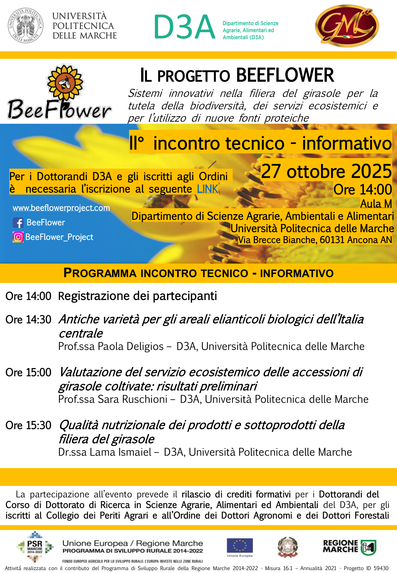 Siete invitati a partecipare al Secondo Incontro tecnico-informativo del Progetto BEEFLOWER. L'incontro si terrà il 27 ottobre 2025 alle ore 14:00 presso il Dipartimento di Scienze Agrarie, Ambientali e Alimentari dell' Università Politecnica delle Marche (Via Brecce Bianche, 60131 Ancona AN) in Aula M. La partecipazione all’evento prevede il rilascio di crediti formativi per i Dottorandi del Corso di Dottorato di Ricerca in Scienze Agrarie, Alimentari ed Ambientali del D3A, per gli iscritti al Collegio dei Periti Agrari e all’Ordine dei Dottori Agronomi e dei Dottori Forestali Per i Dottorandi D3A e gli iscritti agli Ordini è necessaria l'iscrizione al link . Vi ringraziamo per l’attenzione e vi aspettiamo numerosi! Il Gruppo Operativo BeeFlower. EN - Invito al Secondo Incontro tecnico-informativo del progetto BeeFlower You are invited to participate in the Second Technical-Informative Meeting of the BEEFLOWER Project. The meeting will take place on October 27, 2025, at 2:00 PM at the Department of Agricultural, Environmental and Food Sciences of Marche Polytechnic University (Via Brecce Bianche, 60131 Ancona AN), in Aula M . Participation in the event grants training credits for PhD students of the Doctoral Program in Agricultural, Food and Environmental Sciences D3A, as well as for members of the College of Agrarian Experts and the Order of Agronomists and Forestry Doctors. Registration is required for D3A PhD students and members of the Orders via the following link . Thank you for your attention, and we look forward to seeing you! The BEEFLOWER Operational Group